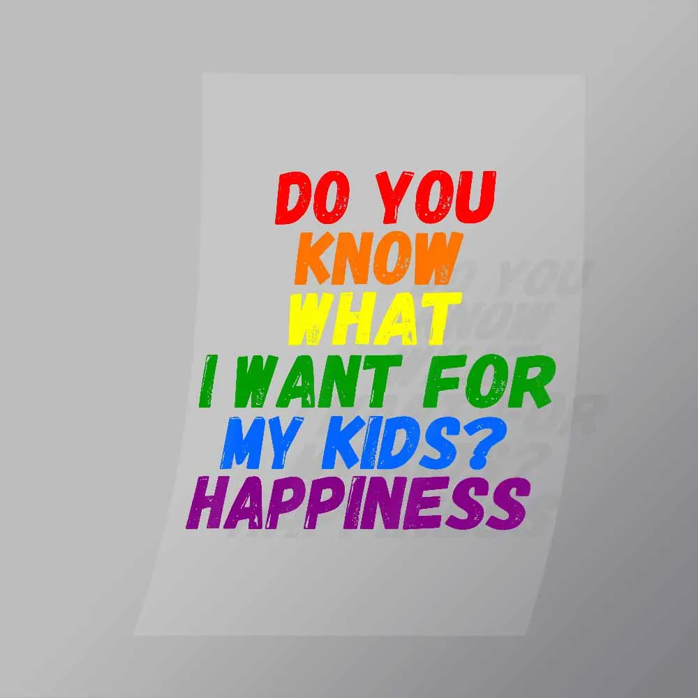 A great Do You Know What I Want For My Kids. Happiness DTF (Direct to Film) Transfer available in multiple sizes. (Beased on width at artwork aspect ratio)