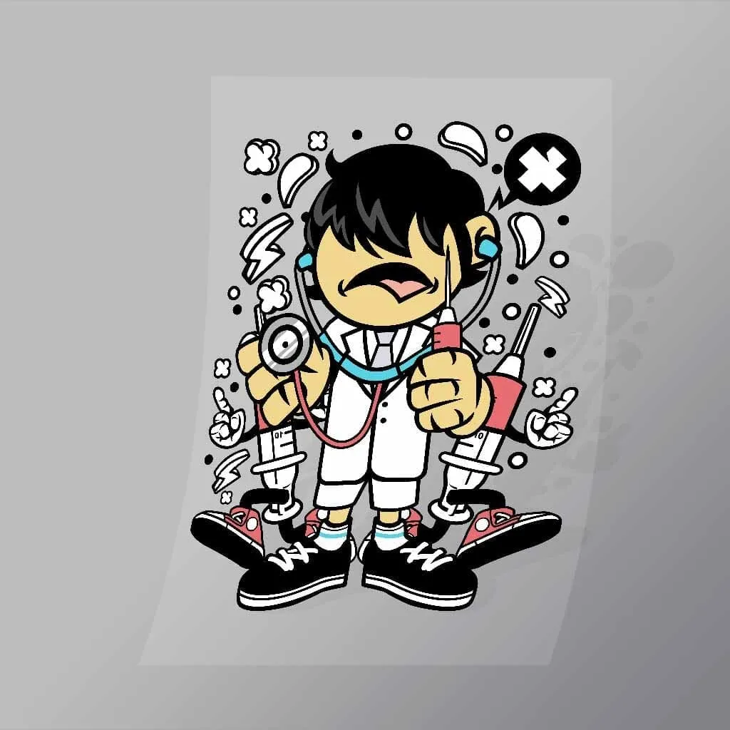 A great Doctor Kid DTF (Direct to Film) Transfer available in multiple sizes. (Beased on width at artwork aspect ratio)