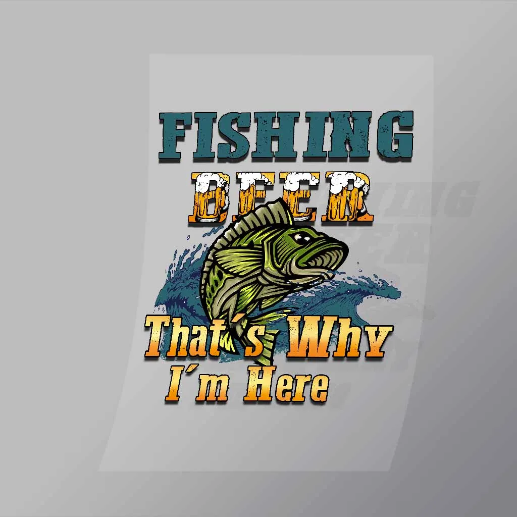 A great Fishing Beer Thats Why Im Here DTF (Direct to Film) Transfer available in multiple sizes. (Beased on width at artwork aspect ratio)