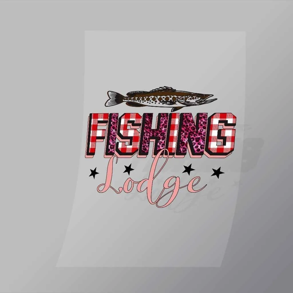 A great Fishing Lodge DTF (Direct to Film) Transfer available in multiple sizes. (Beased on width at artwork aspect ratio)
