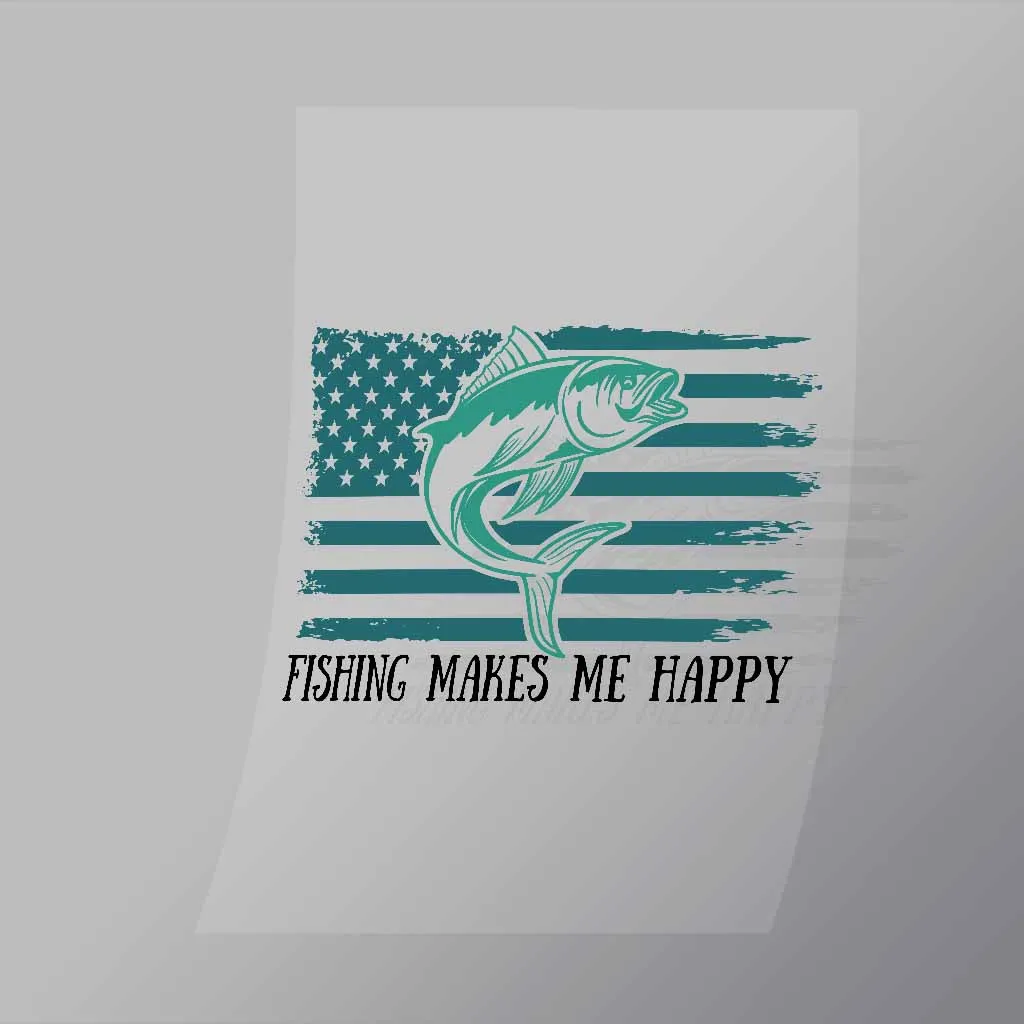 A great Fishing Makes ME Happy America DTF (Direct to Film) Transfer available in multiple sizes. (Beased on width at artwork aspect ratio)