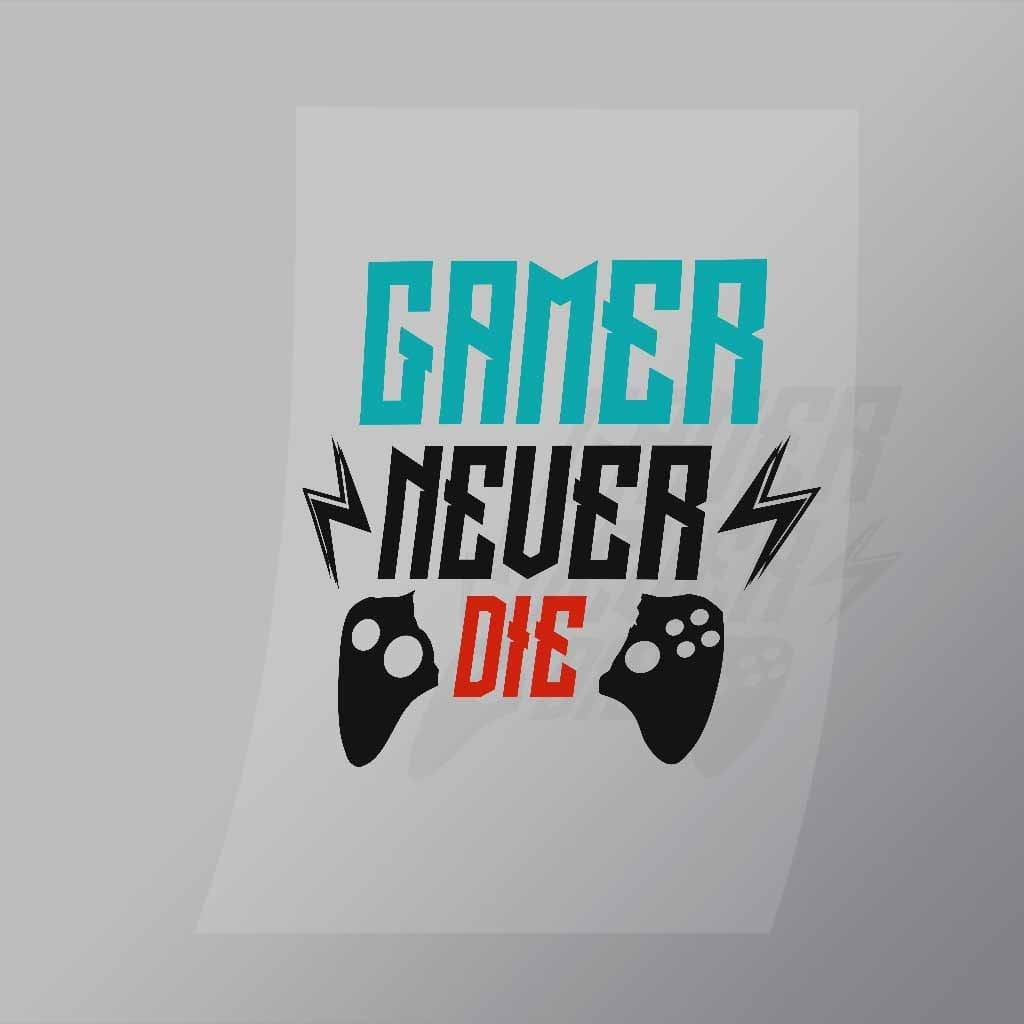 A great Gamer Never Die DTF (Direct to Film) Transfer available in multiple sizes. (Beased on width at artwork aspect ratio)