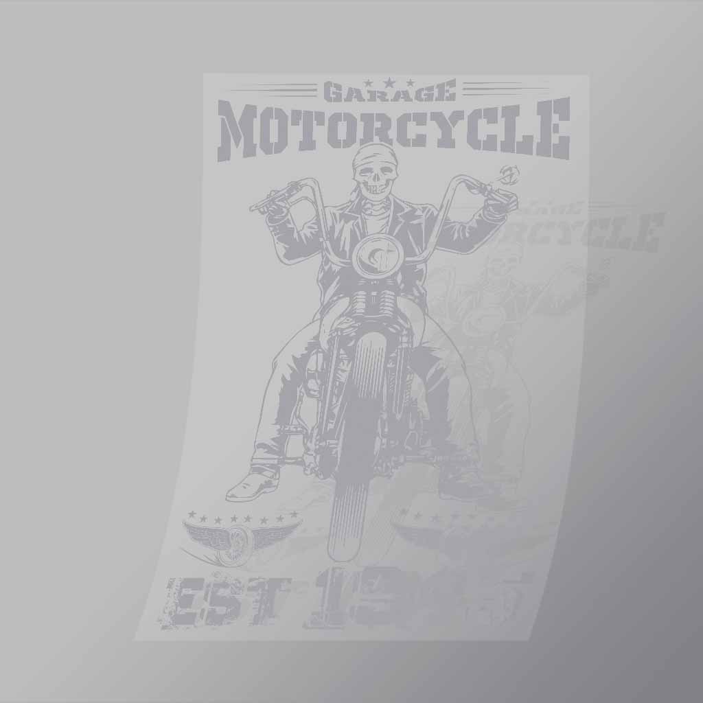 A great Garage Motorcycle DTF (Direct to Film) Transfer available in multiple sizes. (Beased on width at artwork aspect ratio)