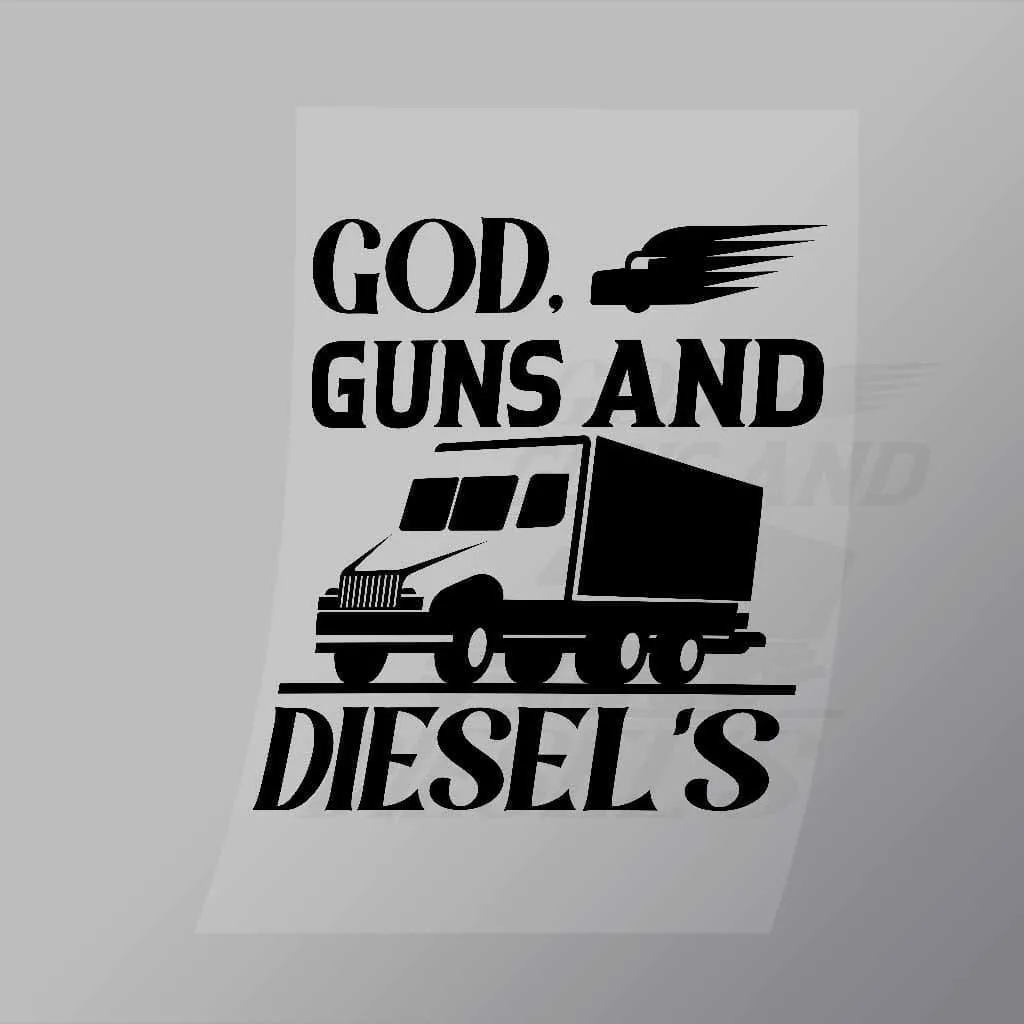 A great God Guns And Diesels DTF (Direct to Film) Transfer available in multiple sizes. (Beased on width at artwork aspect ratio)