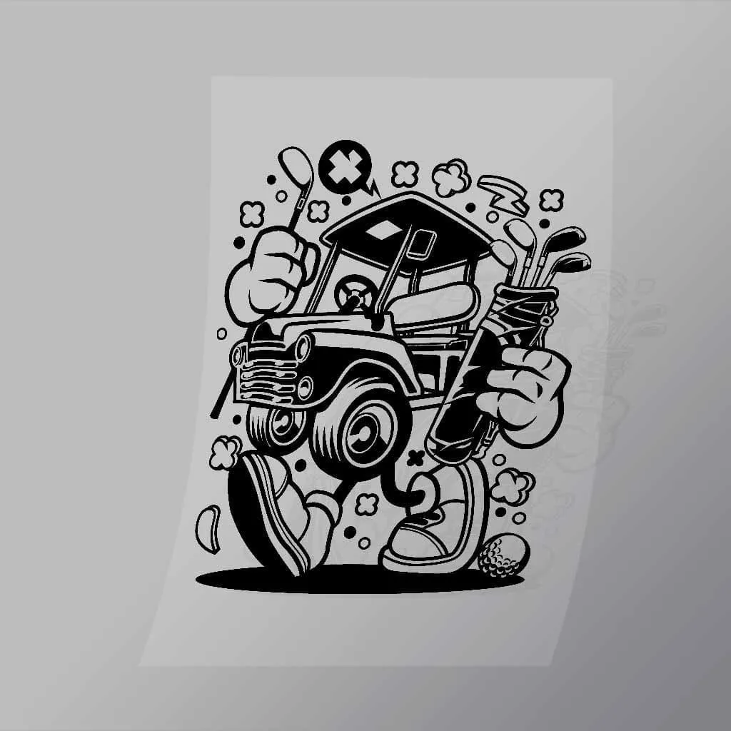 A great Golf Car DTF (Direct to Film) Transfer available in multiple sizes. (Beased on width at artwork aspect ratio)