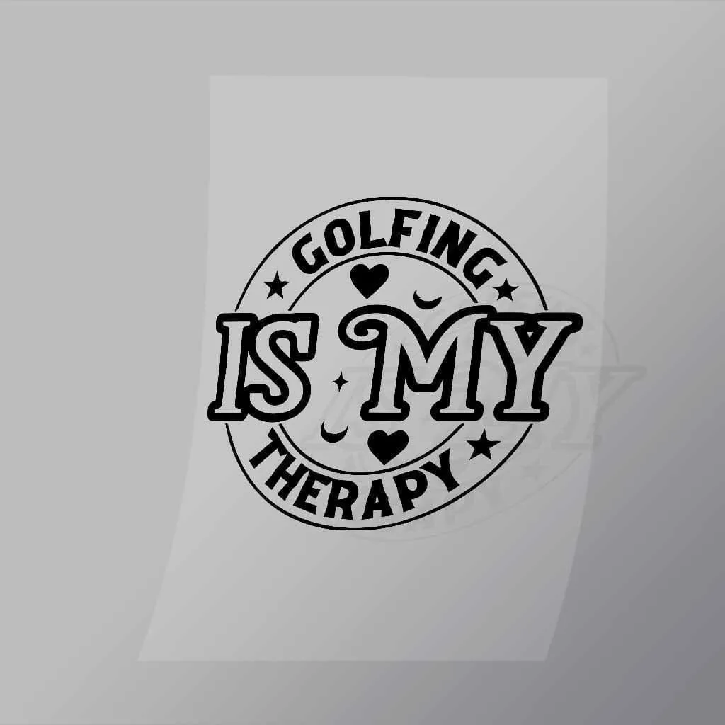 A great Golfing Is My Therapy DTF (Direct to Film) Transfer available in multiple sizes. (Beased on width at artwork aspect ratio)
