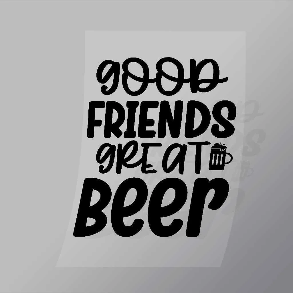 A great Good Friends Great Beer Black DTF (Direct to Film) Transfer available in multiple sizes. (Beased on width at artwork aspect ratio)