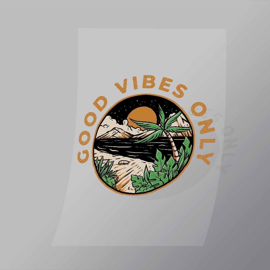 A great Good Vides Only DTF (Direct to Film) Transfer available in multiple sizes. (Beased on width at artwork aspect ratio)