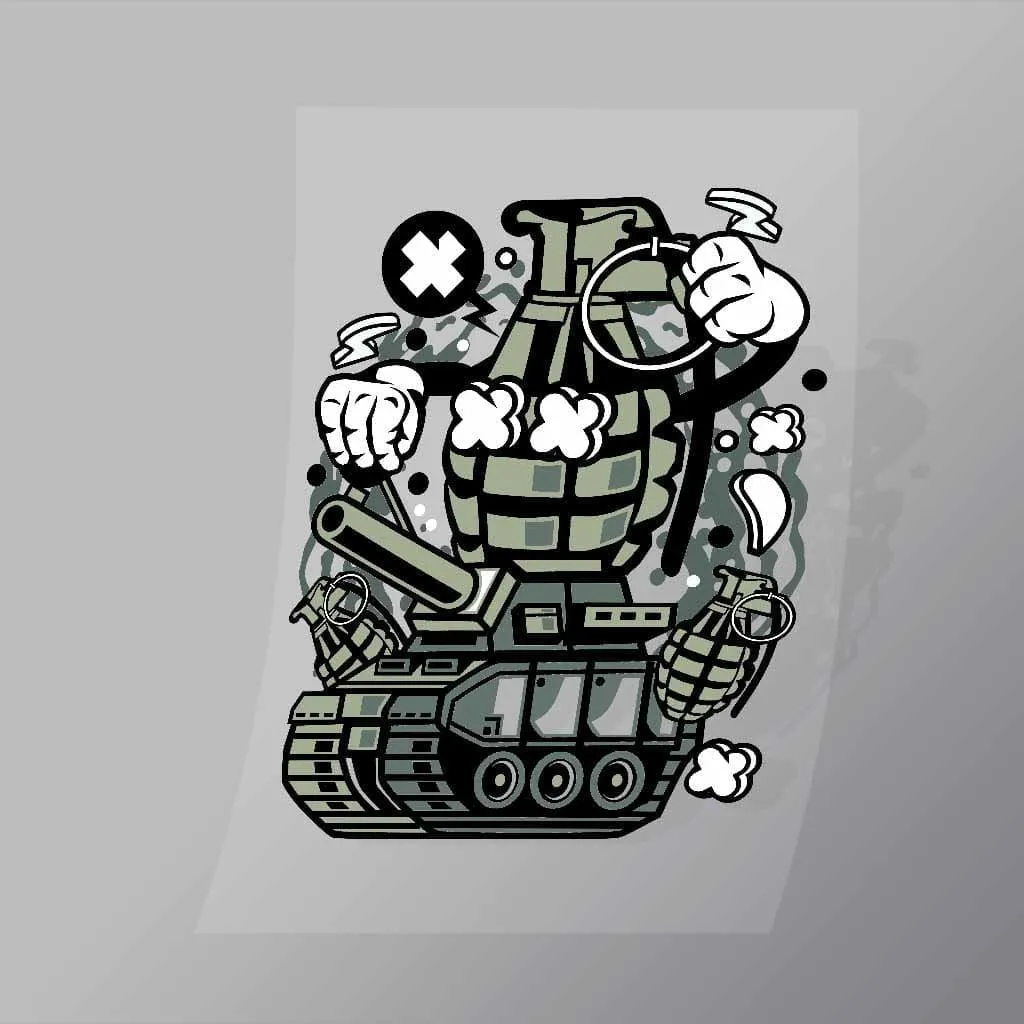 A great Grenade War Tank DTF (Direct to Film) Transfer available in multiple sizes. (Beased on width at artwork aspect ratio)