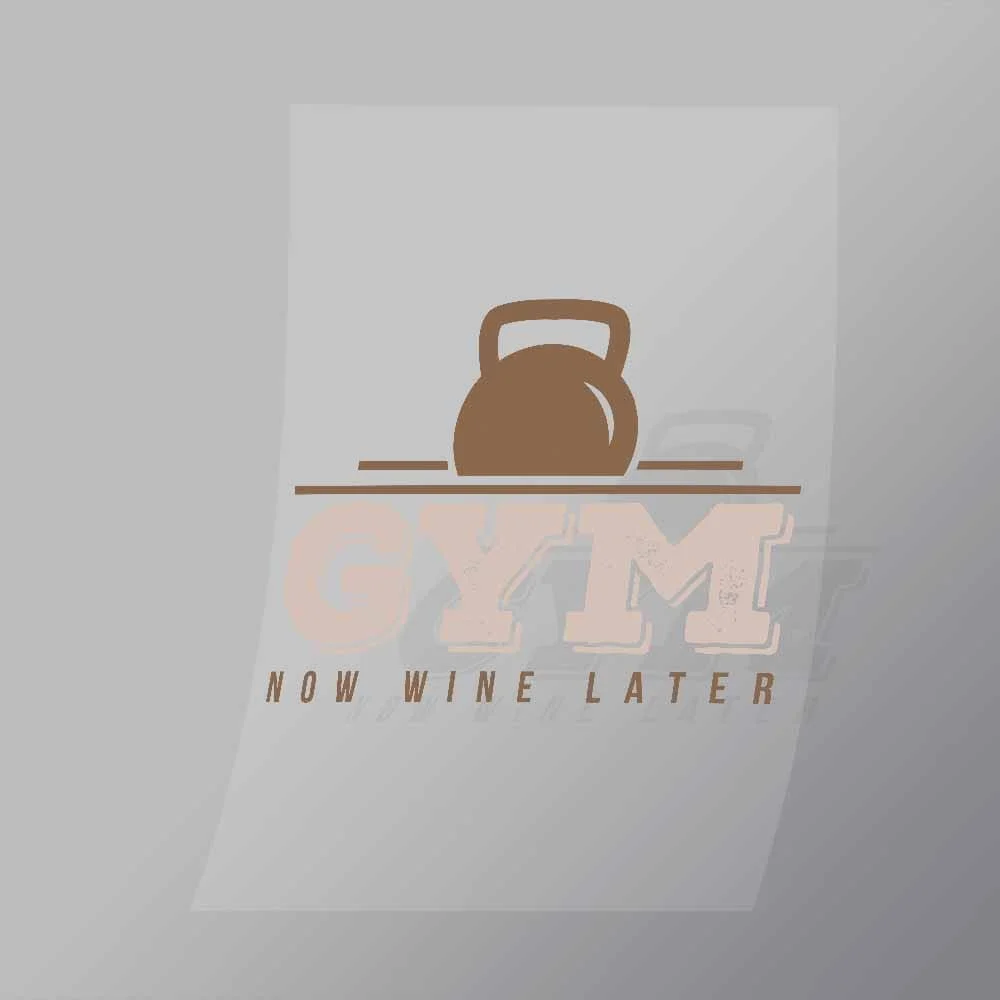 A great Gym Now Wine Later DTF (Direct to Film) Transfer available in multiple sizes. (Beased on width at artwork aspect ratio)