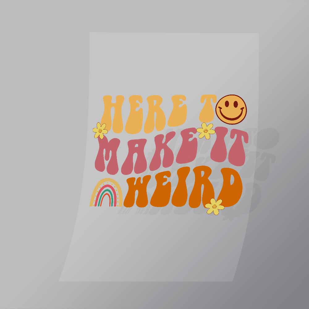 A great Here To Make It Weird DTF (Direct to Film) Transfer available in multiple sizes. (Beased on width at artwork aspect ratio)