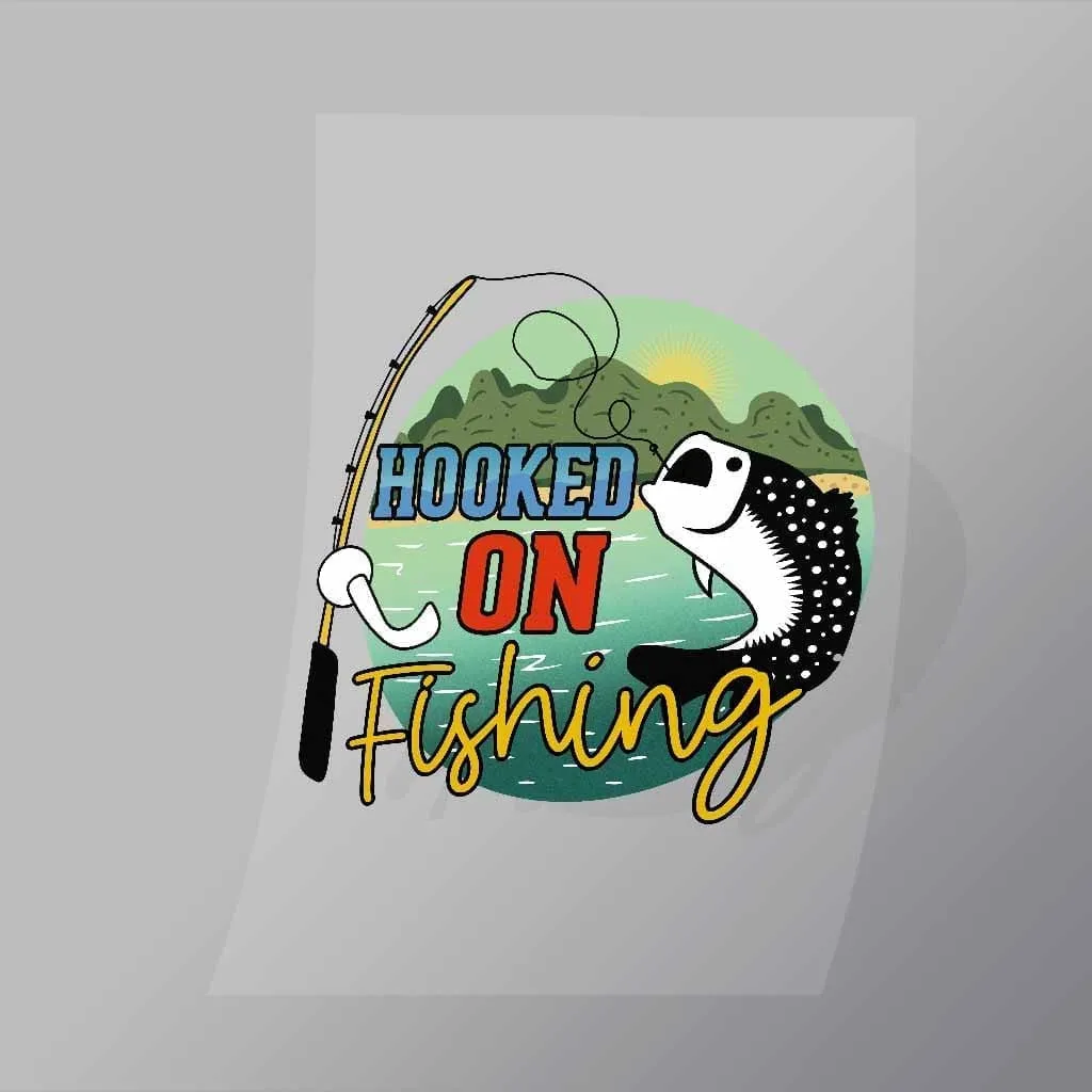 A great Hooked On Fishing DTF (Direct to Film) Transfer available in multiple sizes. (Beased on width at artwork aspect ratio)