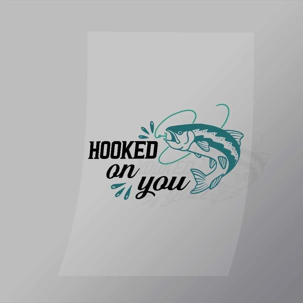 A great Hooked On You DTF (Direct to Film) Transfer available in multiple sizes. (Beased on width at artwork aspect ratio)