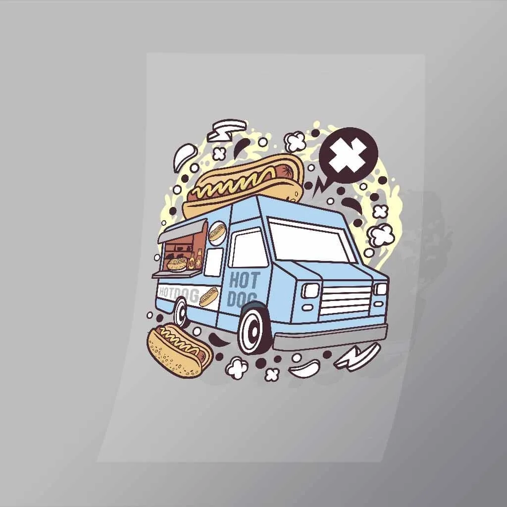 A great Hotdog Van DTF (Direct to Film) Transfer available in multiple sizes. (Beased on width at artwork aspect ratio)