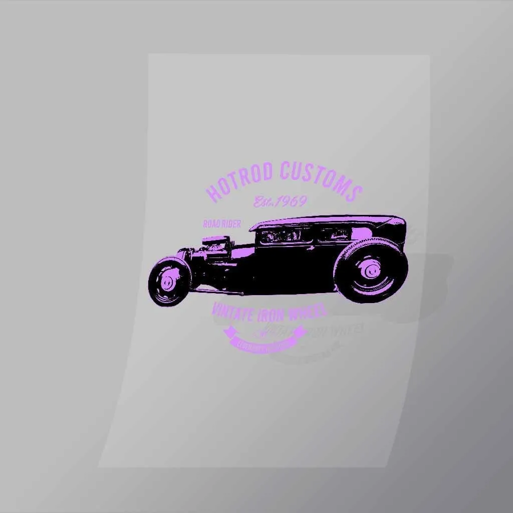 A great Hotrod Customs Est 1969 Purple DTF (Direct to Film) Transfer available in multiple sizes. (Beased on width at artwork aspect ratio)