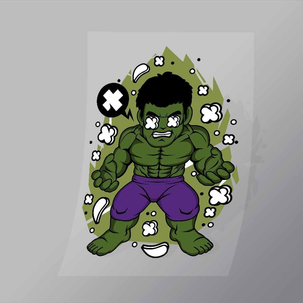 A great Hulk DTF (Direct to Film) Transfer available in multiple sizes. (Beased on width at artwork aspect ratio)