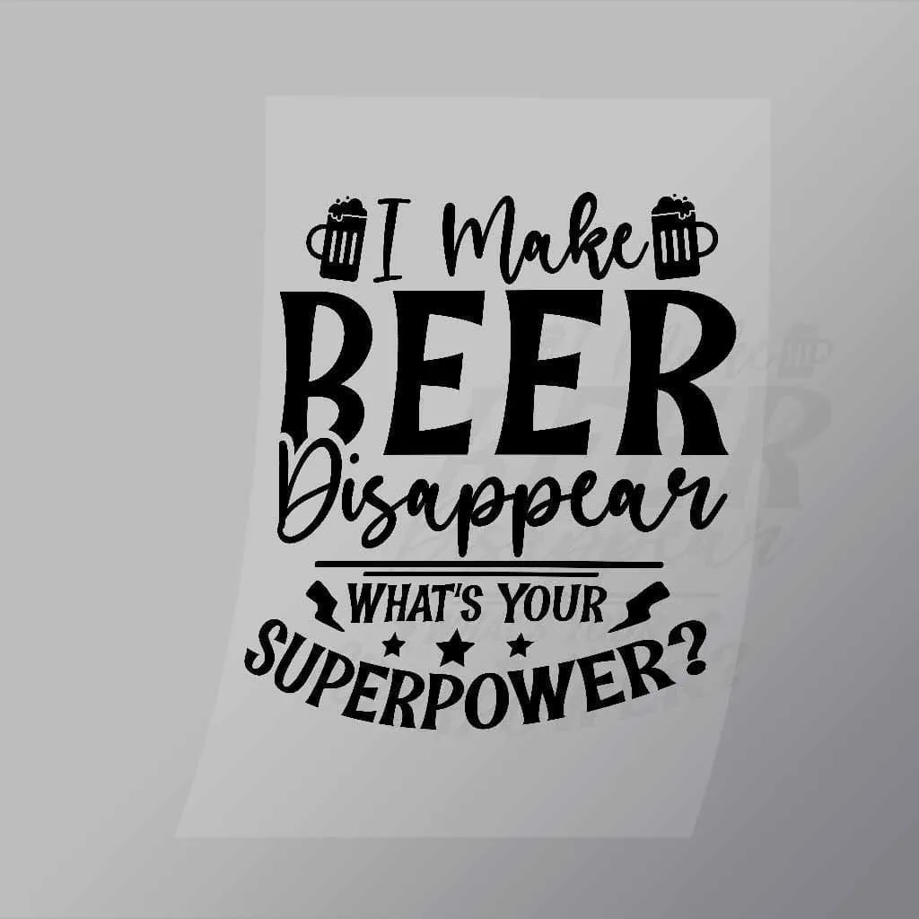 A great I Make Beer Disappear Black DTF (Direct to Film) Transfer available in multiple sizes. (Beased on width at artwork aspect ratio)
