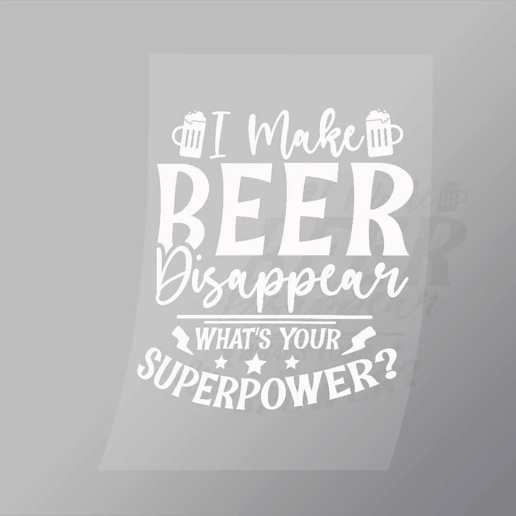 A great I Make Beer Disappear White DTF (Direct to Film) Transfer available in multiple sizes. (Beased on width at artwork aspect ratio)
