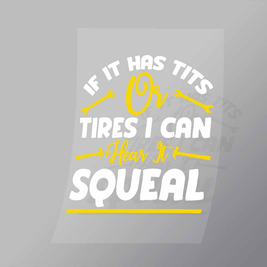 A great If It Has Tits Or Tires I Can Hear It Squeal DTF (Direct to Film) Transfer available in multiple sizes. (Beased on width at artwork aspect ratio)