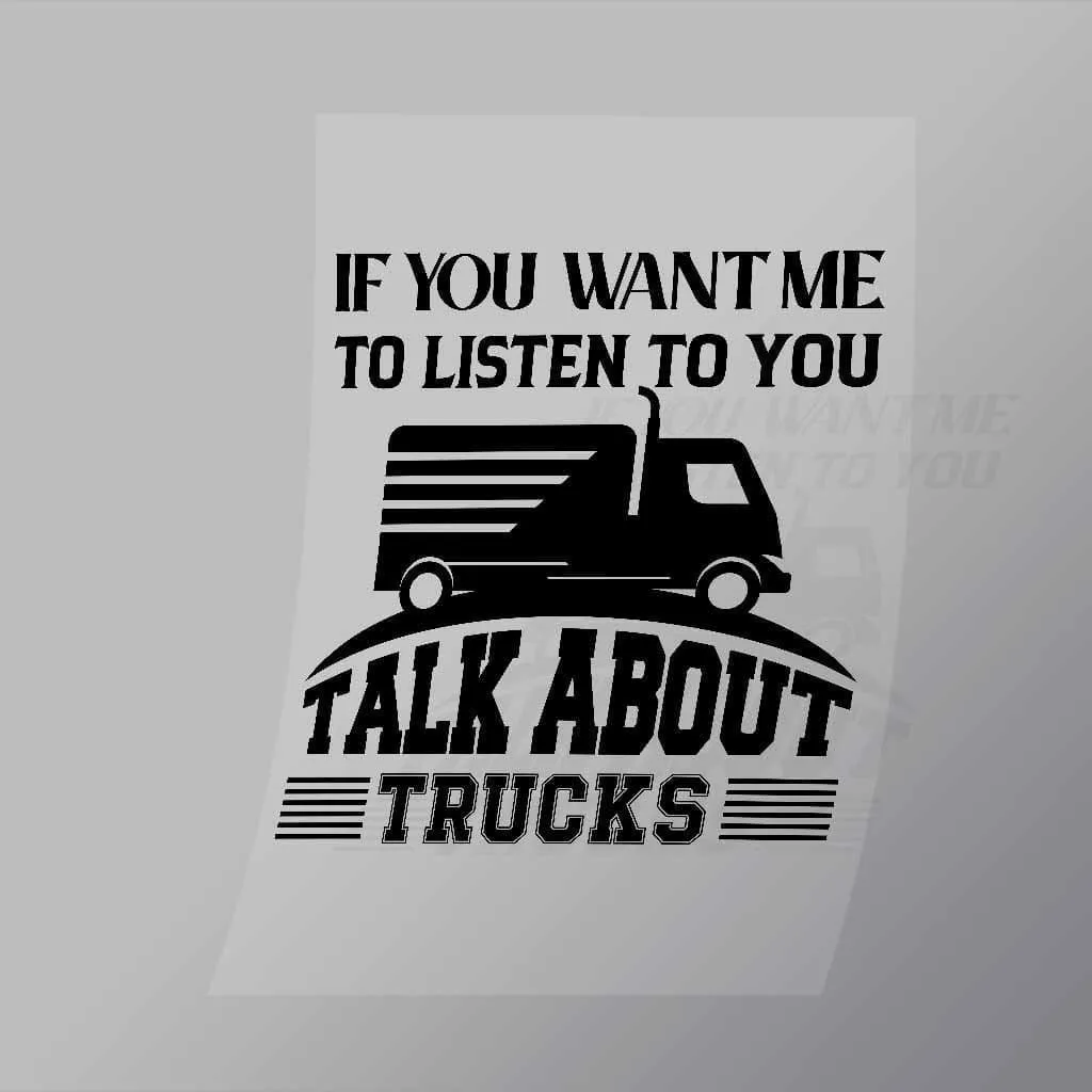 A great If You Want Me To Listen To You Talk About Trucks DTF (Direct to Film) Transfer available in multiple sizes. (Beased on width at artwork aspect ratio)