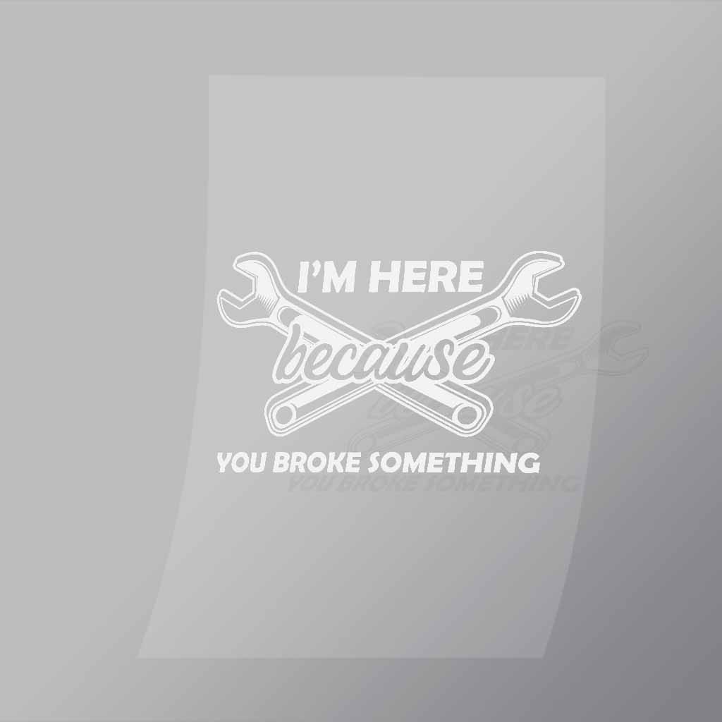 A great Im Here Because You Broke Something DTF (Direct to Film) Transfer available in multiple sizes. (Beased on width at artwork aspect ratio)