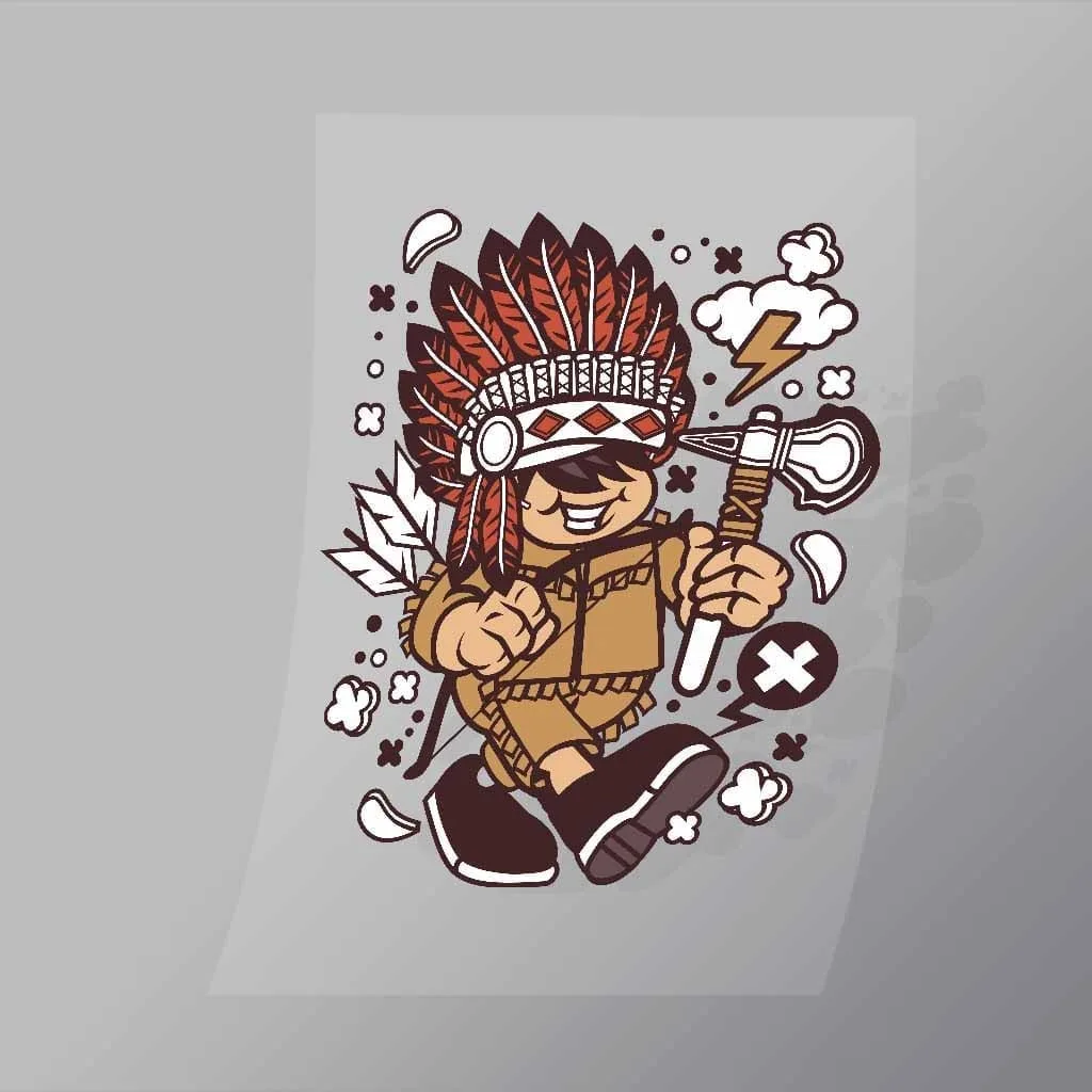 A great Indian Chief Kid DTF (Direct to Film) Transfer available in multiple sizes. (Beased on width at artwork aspect ratio)