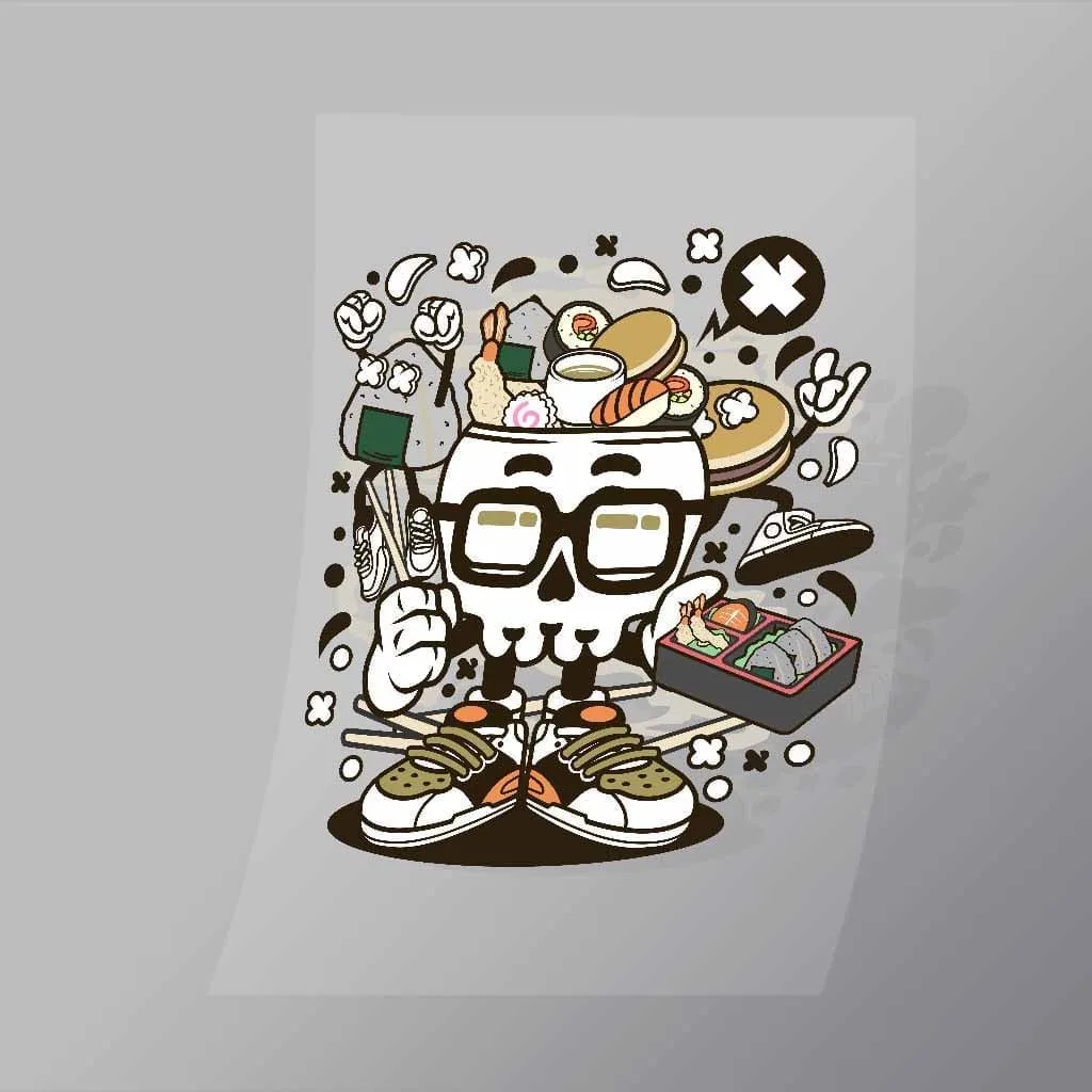 A great Japanese Food Skull DTF (Direct to Film) Transfer available in multiple sizes. (Beased on width at artwork aspect ratio)