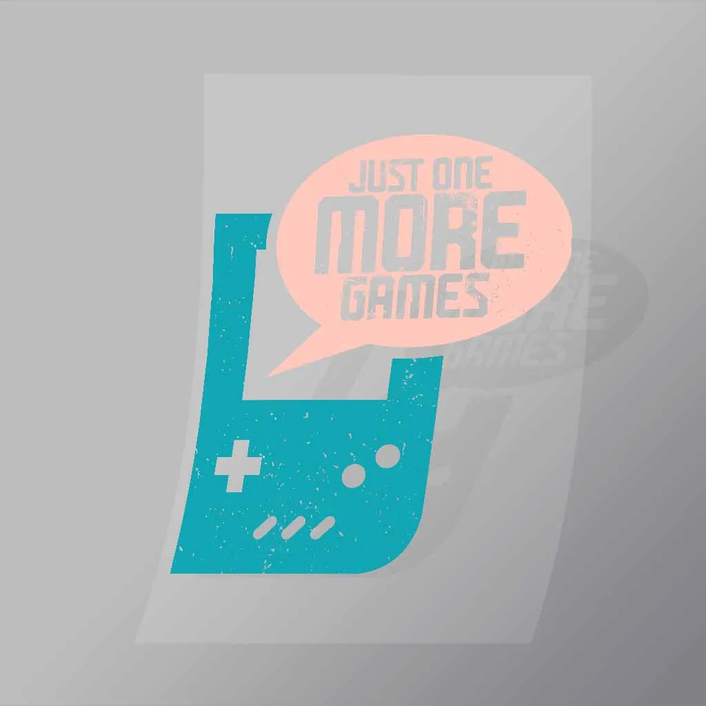 A great Just One More Games DTF (Direct to Film) Transfer available in multiple sizes. (Beased on width at artwork aspect ratio)