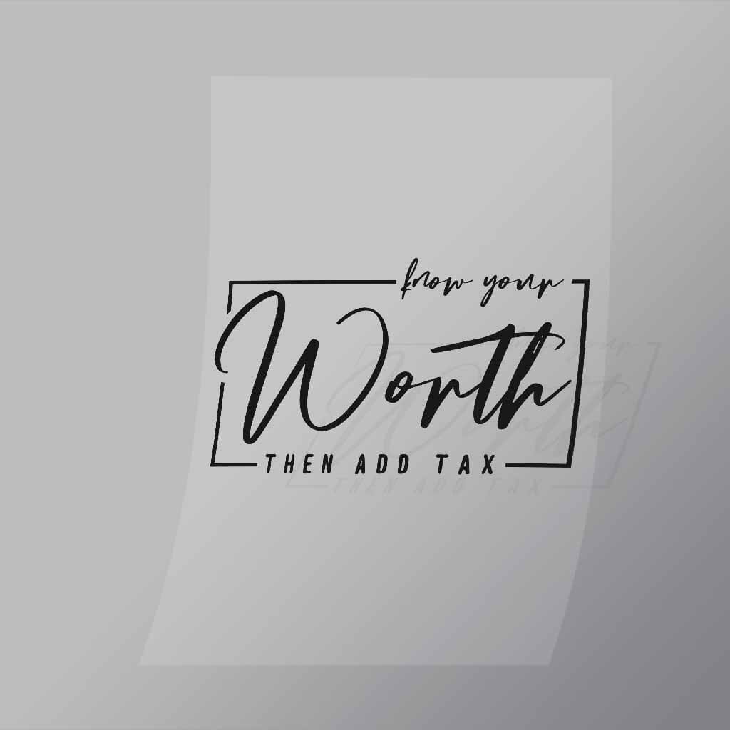 A great Know Your Worth Then Add Tax DTF (Direct to Film) Transfer available in multiple sizes. (Beased on width at artwork aspect ratio)