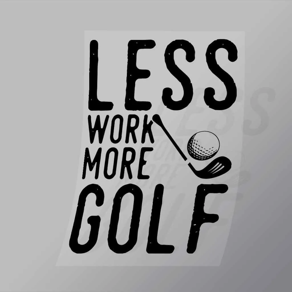 A great Less Work More Golf DTF (Direct to Film) Transfer available in multiple sizes. (Beased on width at artwork aspect ratio)