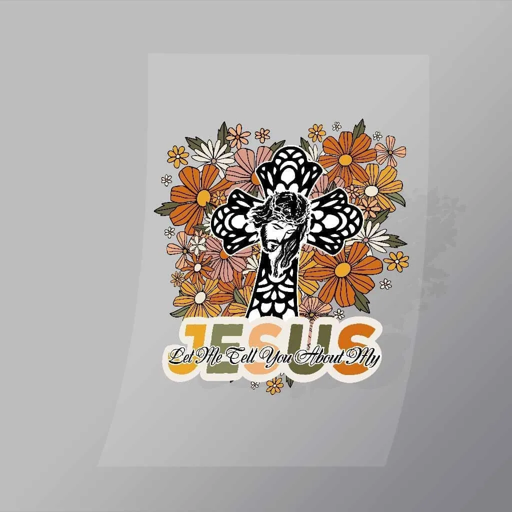 A great Let ME Tell You About My Jesus DTF (Direct to Film) Transfer available in multiple sizes. (Beased on width at artwork aspect ratio)