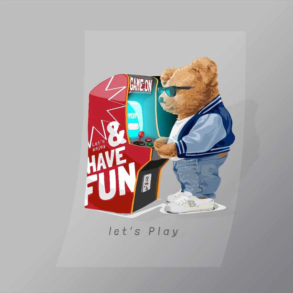 A great Lets Play Gaming Bear DTF (Direct to Film) Transfer available in multiple sizes. (Beased on width at artwork aspect ratio)