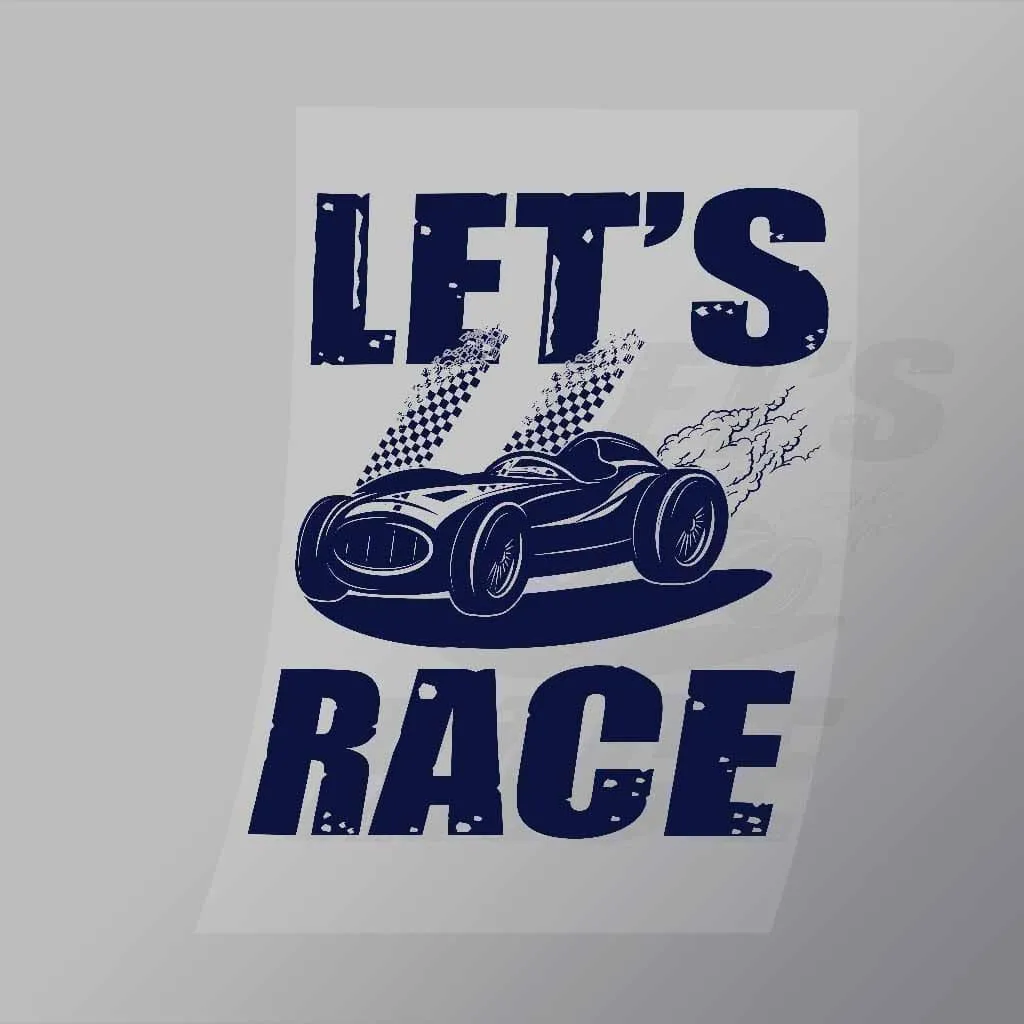 A great Lets Race Blue DTF (Direct to Film) Transfer available in multiple sizes. (Beased on width at artwork aspect ratio)