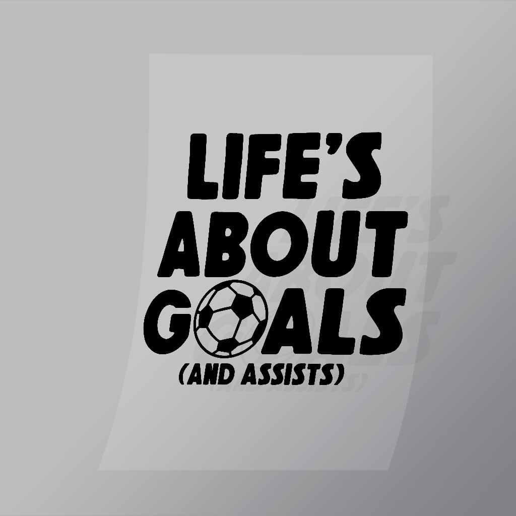 A great Lifes About Goals and Assists DTF (Direct to Film) Transfer available in multiple sizes. (Beased on width at artwork aspect ratio)