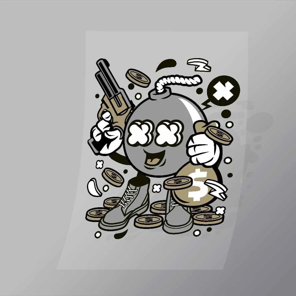 A great Money Takers Bomb DTF (Direct to Film) Transfer available in multiple sizes. (Beased on width at artwork aspect ratio)