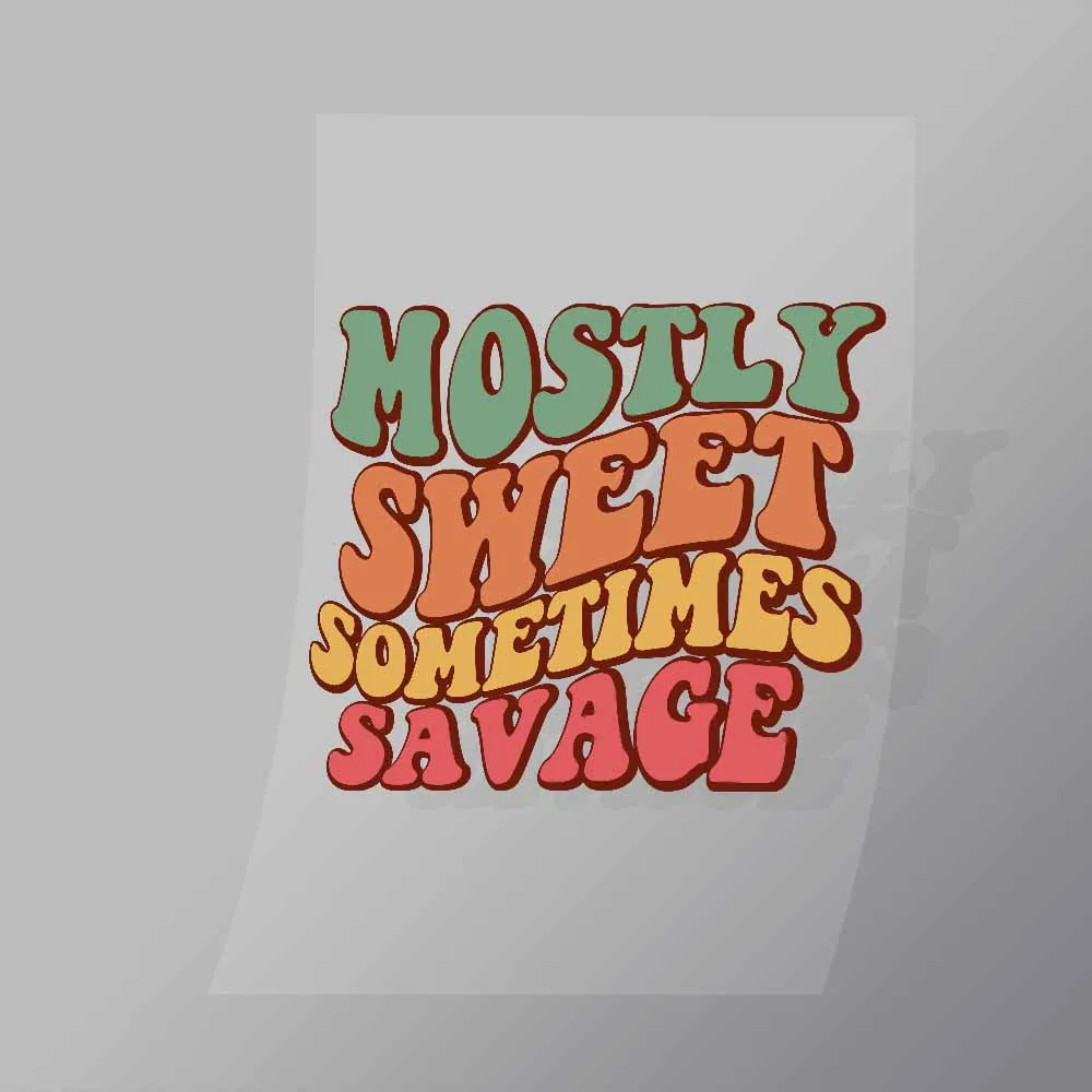 A great Mostly Sweet Sometimes Savage DTF (Direct to Film) Transfer available in multiple sizes. (Beased on width at artwork aspect ratio)