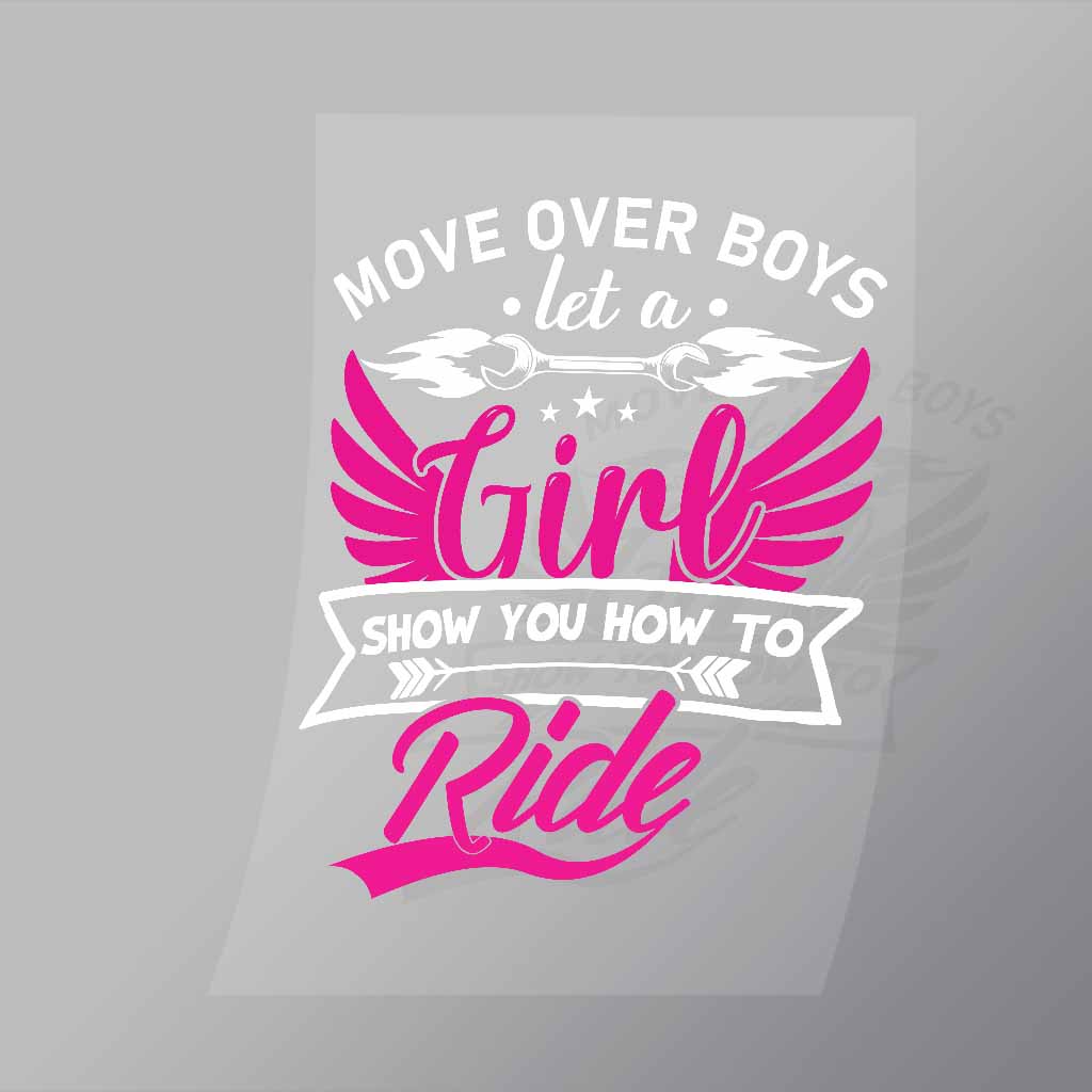 A great Move Over Boys Let A Girl Show You How To Ride DTF (Direct to Film) Transfer available in multiple sizes. (Beased on width at artwork aspect ratio)