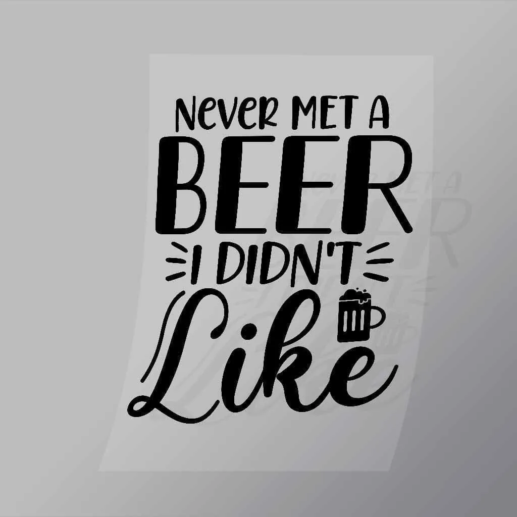 A great Never Met A Beer I Didnt Like Black DTF (Direct to Film) Transfer available in multiple sizes. (Beased on width at artwork aspect ratio)