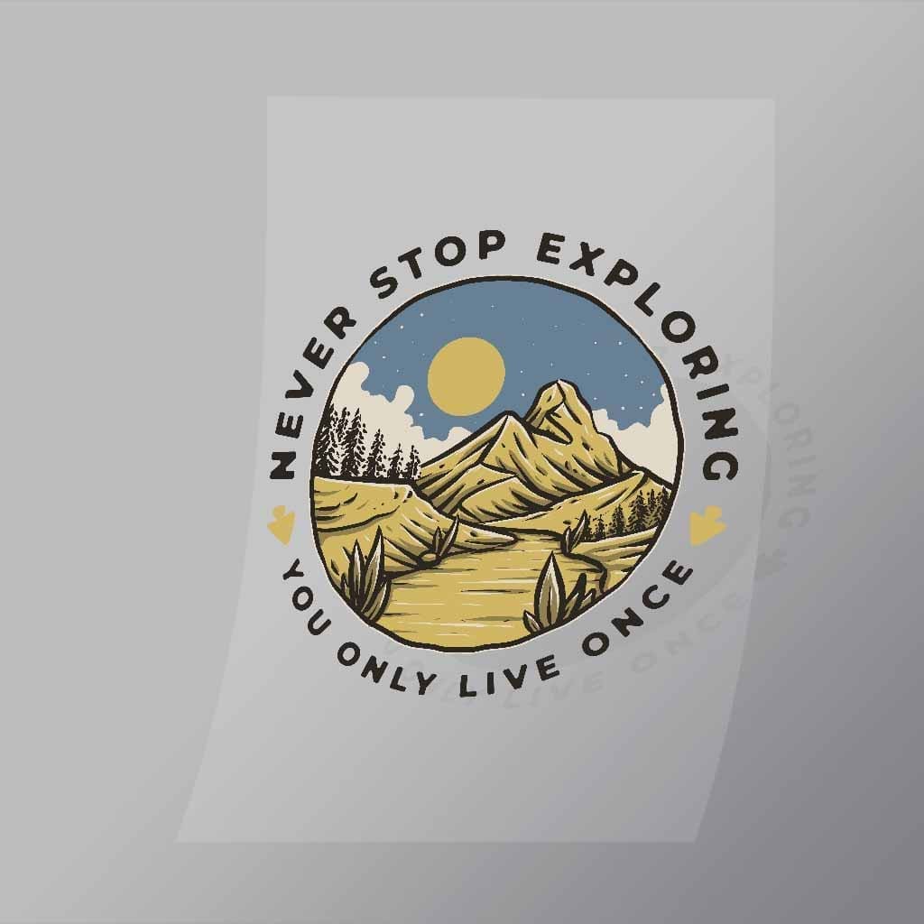 A great Never Stop Exploring You Only Live Once DTF (Direct to Film) Transfer available in multiple sizes. (Beased on width at artwork aspect ratio)