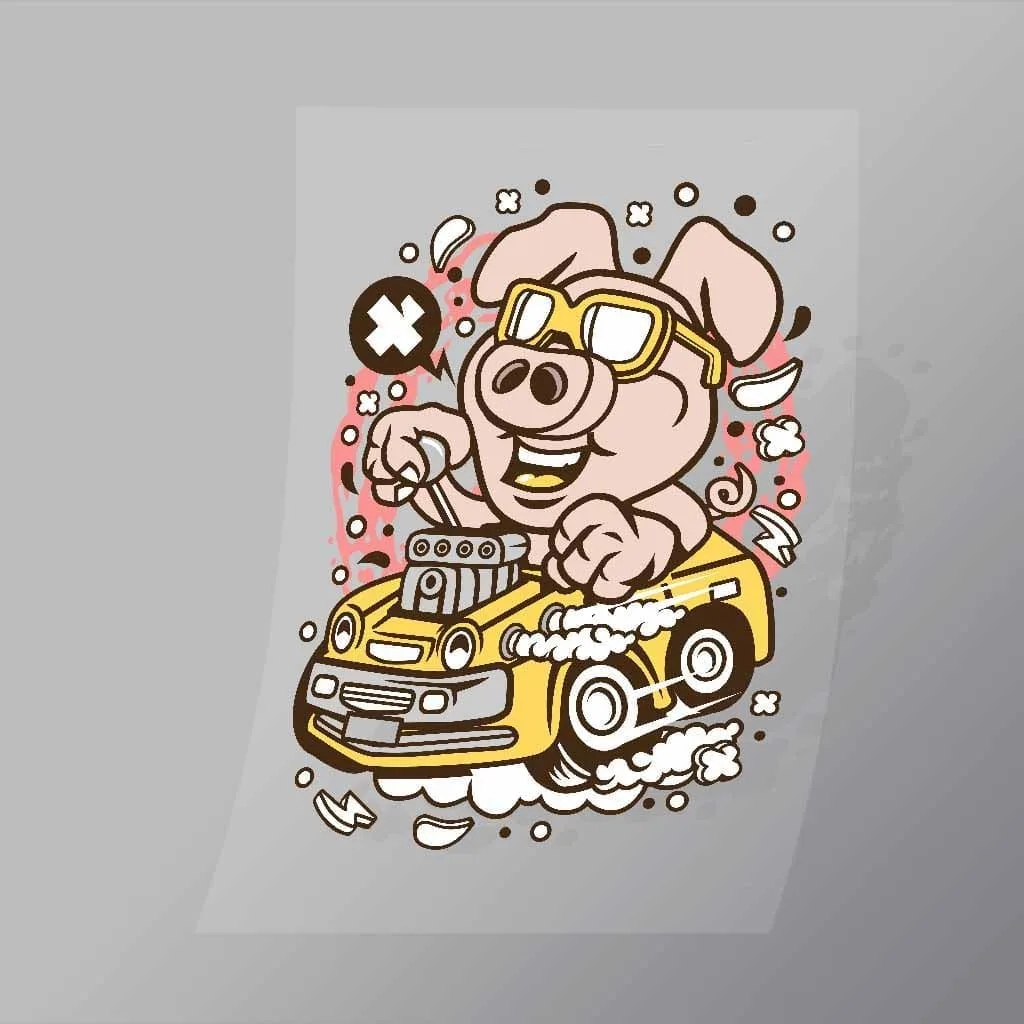 A great Oink Hotrod DTF (Direct to Film) Transfer available in multiple sizes. (Beased on width at artwork aspect ratio)