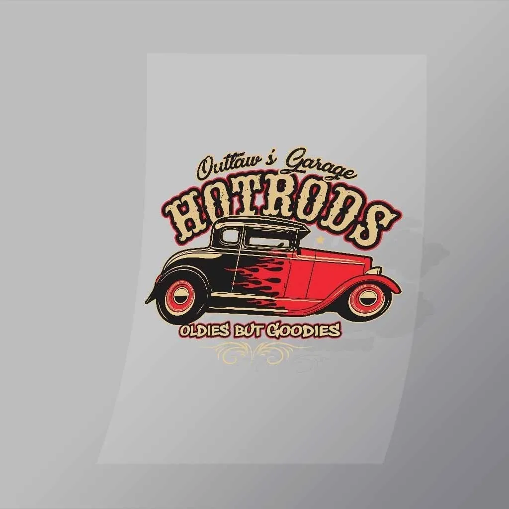 A great Outlaw and Garage Hotrods DTF (Direct to Film) Transfer available in multiple sizes. (Beased on width at artwork aspect ratio)