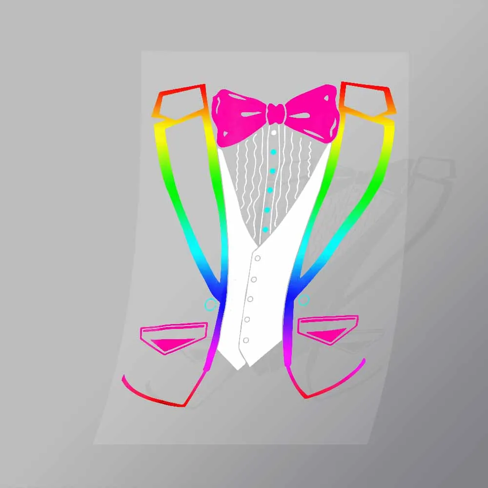 A great Pride Tuxedo DTF (Direct to Film) Transfer available in multiple sizes. (Beased on width at artwork aspect ratio)