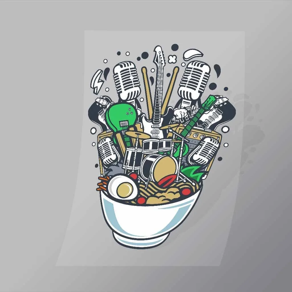 A great Ramen Rock DTF (Direct to Film) Transfer available in multiple sizes. (Beased on width at artwork aspect ratio)