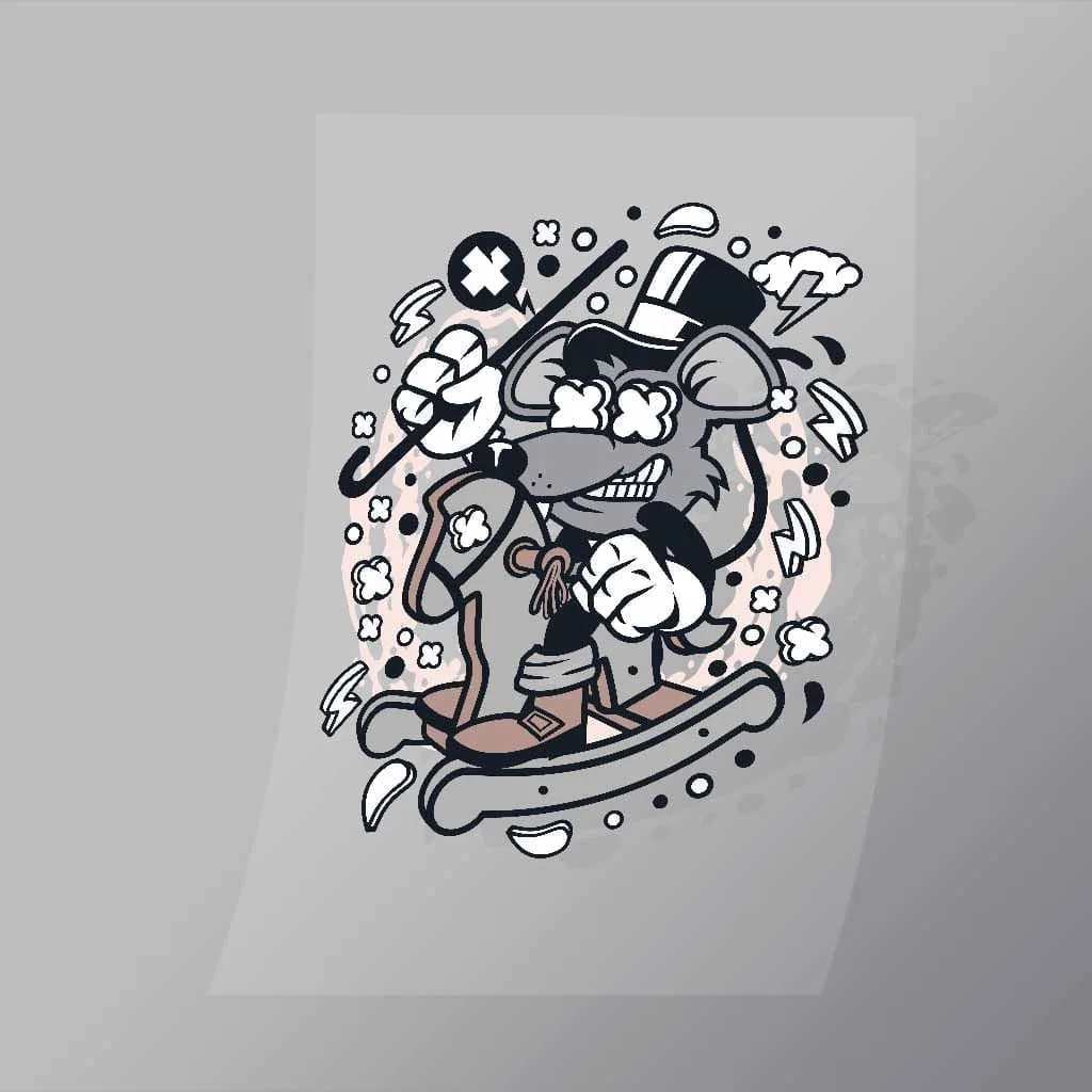 A great Rat Rocking Horse DTF (Direct to Film) Transfer available in multiple sizes. (Beased on width at artwork aspect ratio)