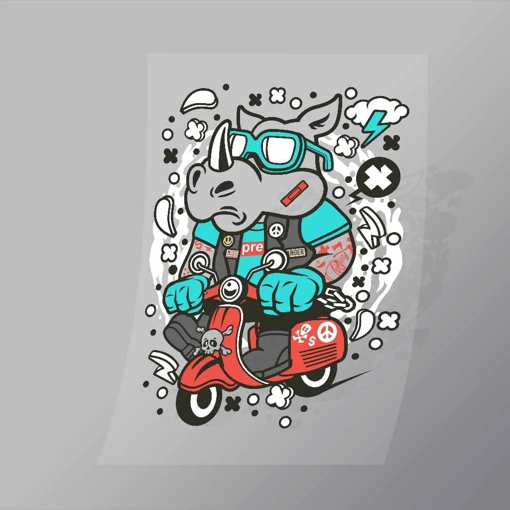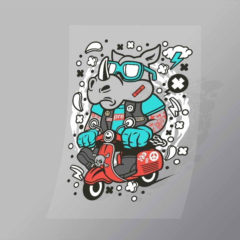 A great Rhino Scooterist DTF (Direct to Film) Transfer available in multiple sizes. (Beased on width at artwork aspect ratio)