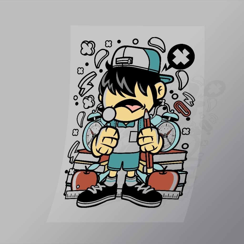 A great School Kid DTF (Direct to Film) Transfer available in multiple sizes. (Beased on width at artwork aspect ratio)
