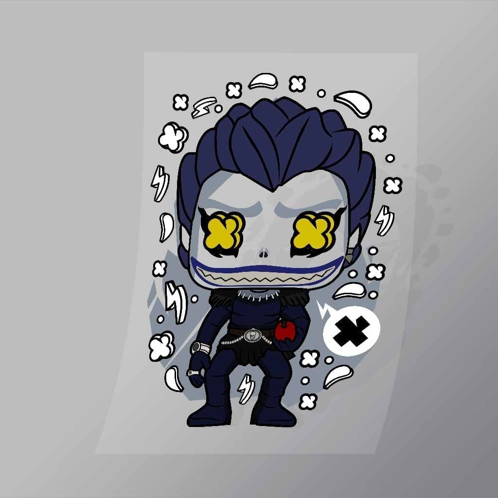 A great Shinigami Ryuk DTF (Direct to Film) Transfer available in multiple sizes. (Beased on width at artwork aspect ratio)