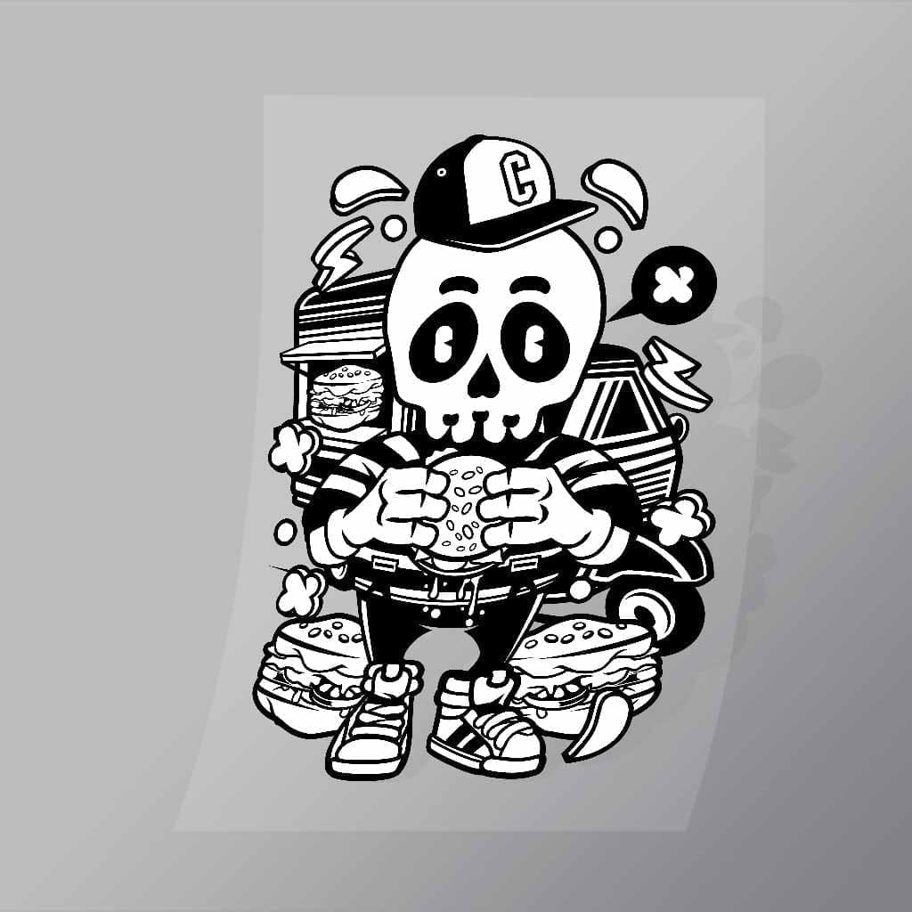 A great Skull Burger DTF (Direct to Film) Transfer available in multiple sizes. (Beased on width at artwork aspect ratio)