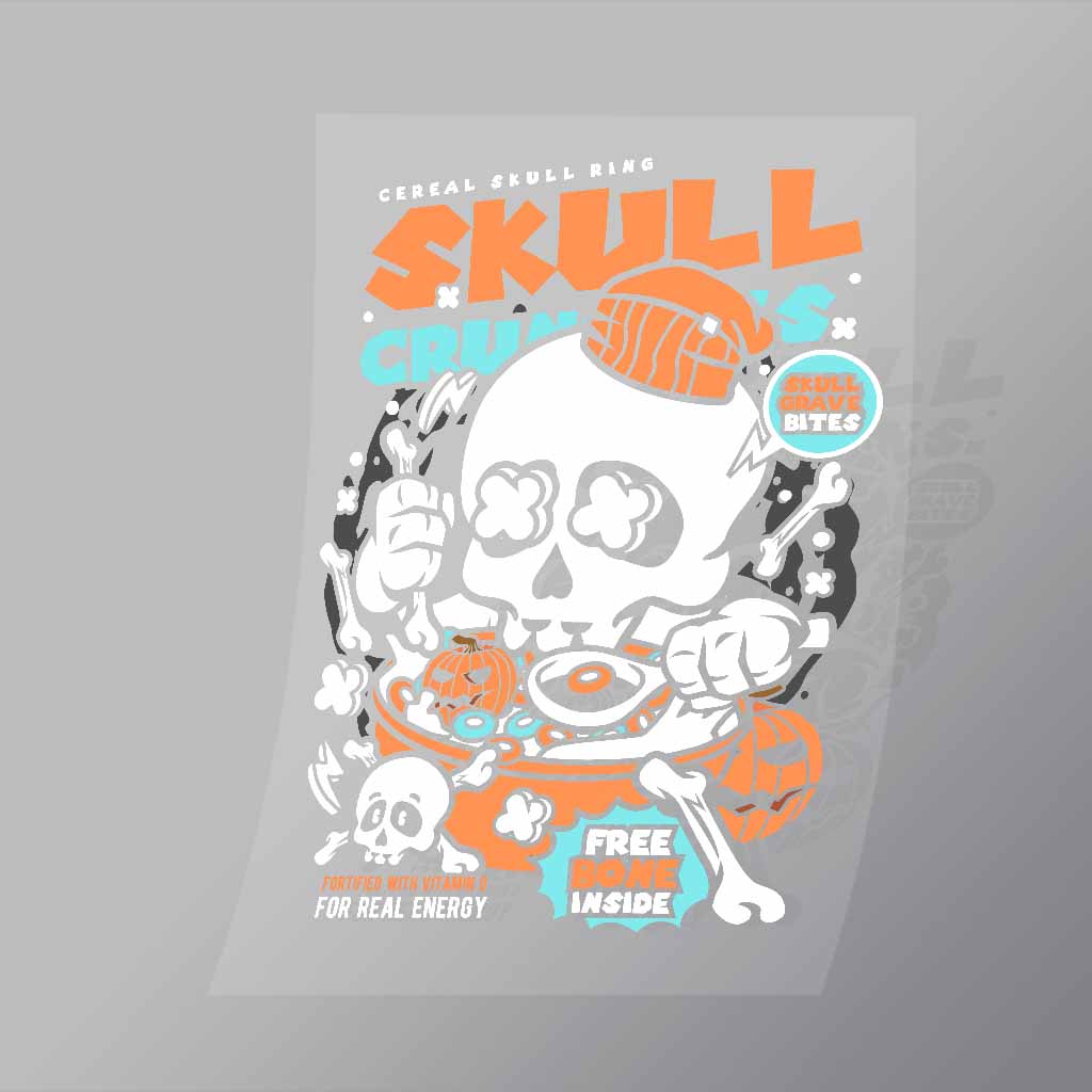 A great Skull Crunchies DTF (Direct to Film) Transfer available in multiple sizes. (Beased on width at artwork aspect ratio)