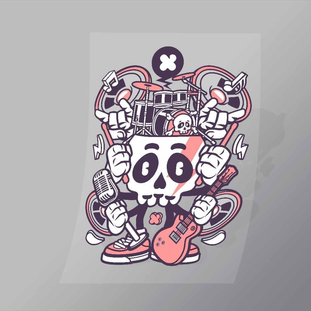 A great Skull of Rock DTF (Direct to Film) Transfer available in multiple sizes. (Beased on width at artwork aspect ratio)